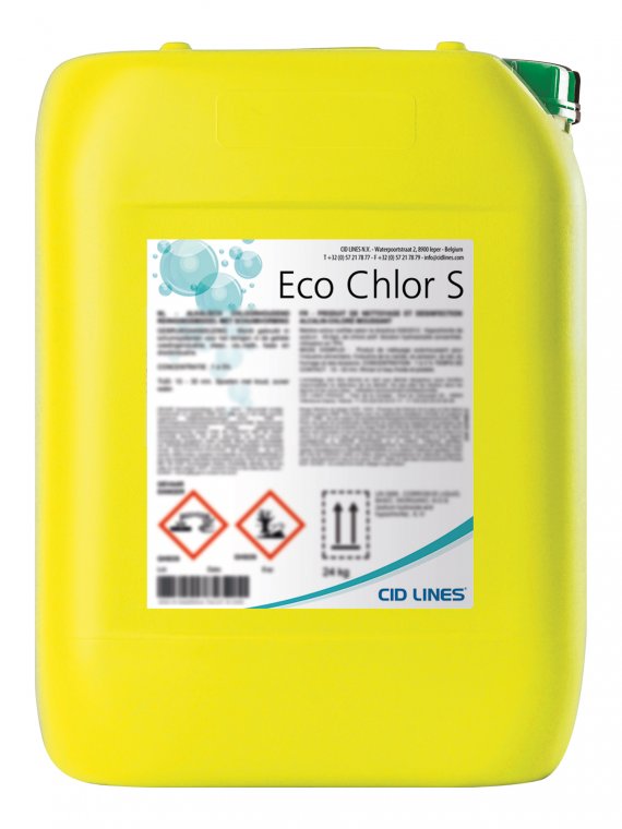 Eco chlor S er sérstaklega hannað þar sem þrif þurfa, góða kvoðueiginleika, leysa vel upp fitu og vernda viðkvæm yfirborð eins og ál og vatnsmálaða fleti. Efnið hefur einnig bleikingar áhrif. Efnið er með sótthreinsivottun samkvæmt reglugerð (EU) 528/2012 49 g/L virkur klór (Sodium hypochlorite) (CAS no.:7681-52-9) Vottað sem PT4 (Biocide for the food industry)